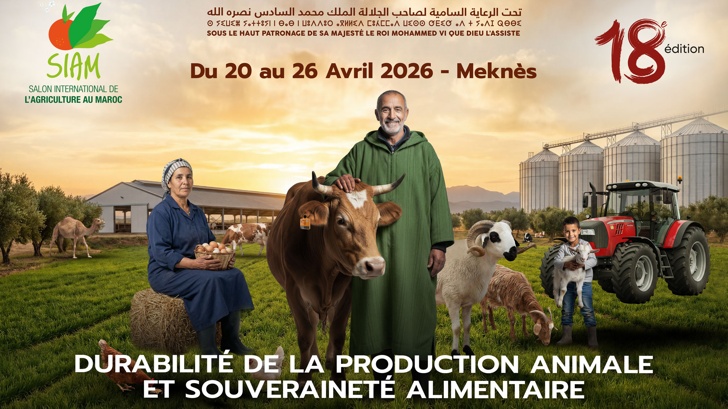 La 18ème édition du Salon International de l’Agriculture au Maroc (SIAM) aura lieu du Lundi 20 au Dimanche 26 avril 2026 à Meknès, sous le thème « Durabilité de la production animale et souveraineté alimentaire». Placée sous le Haut Patronage de Sa Majesté le Roi Mohammed VI, que Dieu l’assiste.