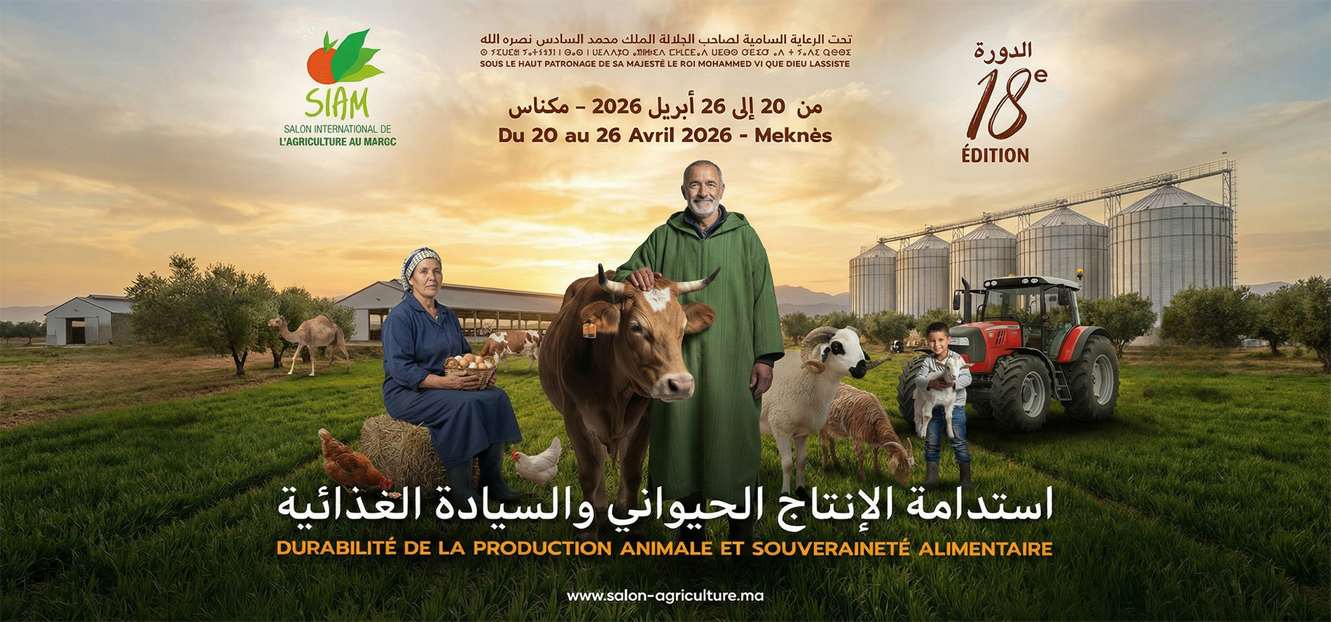 La 18ème édition du Salon International de l’Agriculture au Maroc (SIAM) aura lieu du Lundi 20 au Dimanche 26 avril 2026 à Meknès, sous le thème « Durabilité de la production animale et souveraineté alimentaire». Placée sous le Haut Patronage de Sa Majesté le Roi Mohammed VI, que Dieu l’assiste.